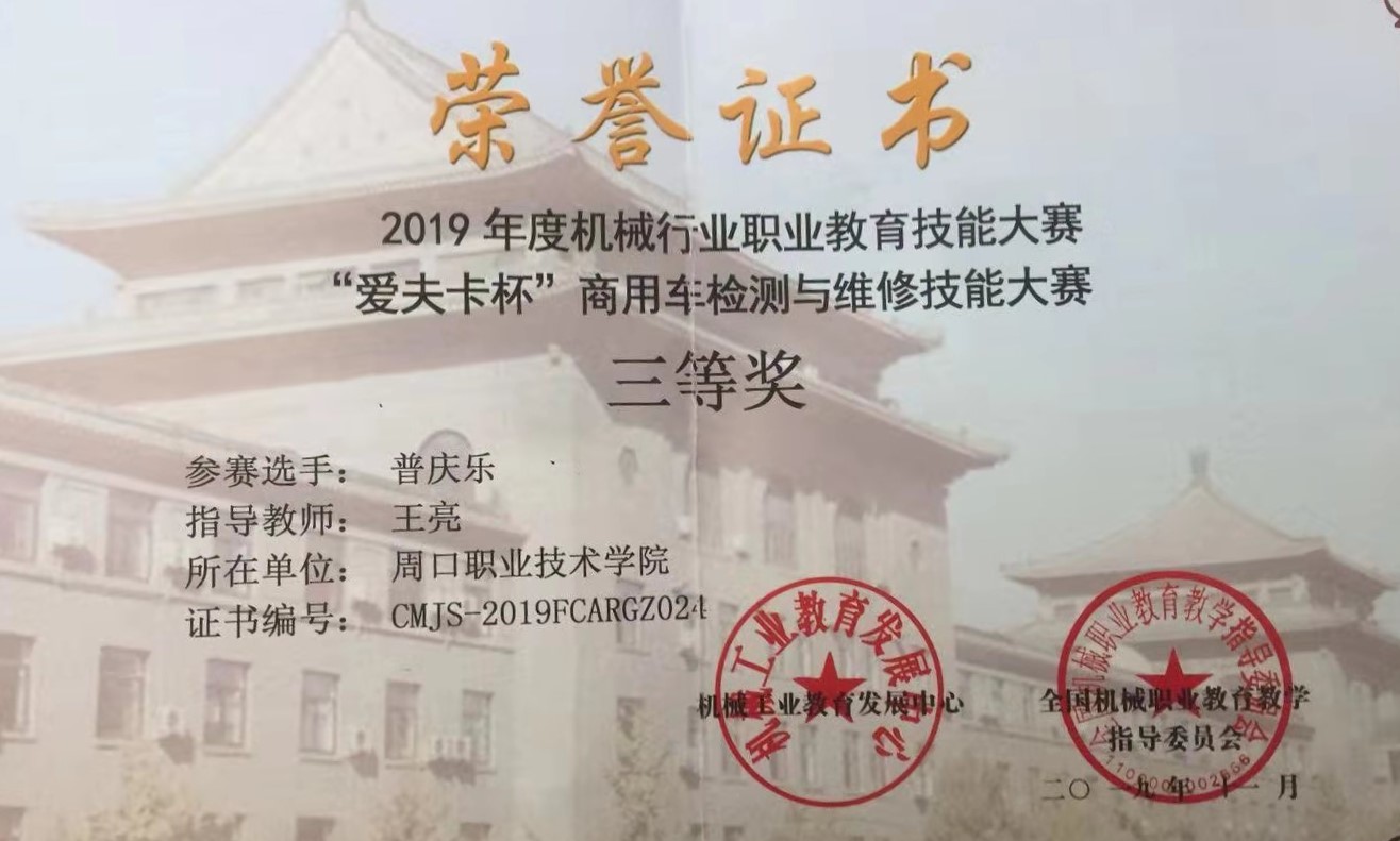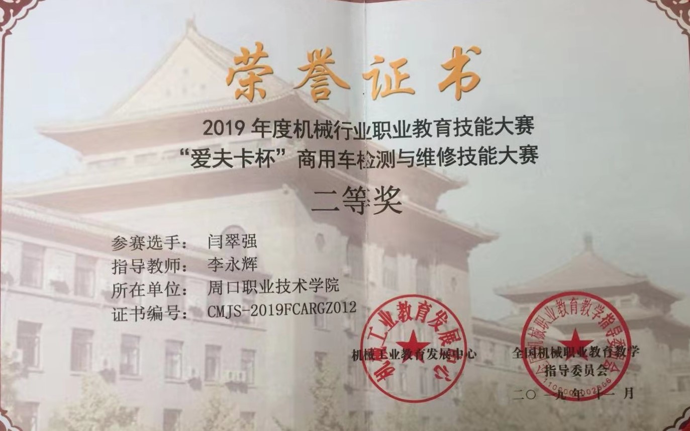 公司员工在2019年全国机械行业职业教育技能大赛 “爱夫卡杯”商用车检测与维修技能大赛中再创佳绩