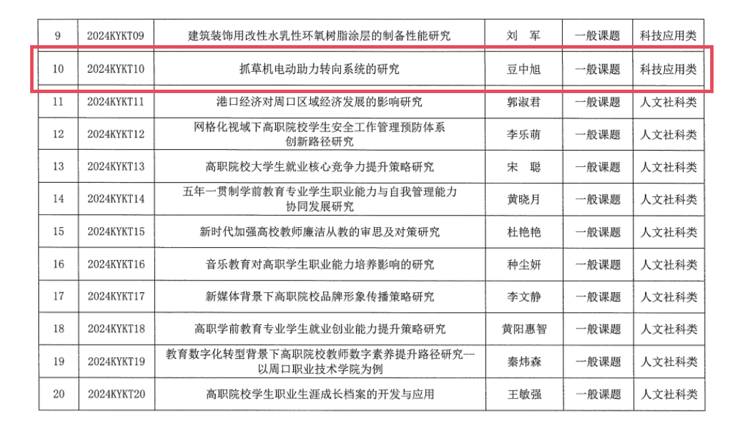 近日,公司公布2024年度校级专项课题拟立项名单,公司关于申报2024年度校级科研课题的通知》精神,经个人申请、部门推荐、科研处初审、专家评审,公司豆中旭主持的课题《抓草机电动助力转向系统的研究》获科技应用类立项。