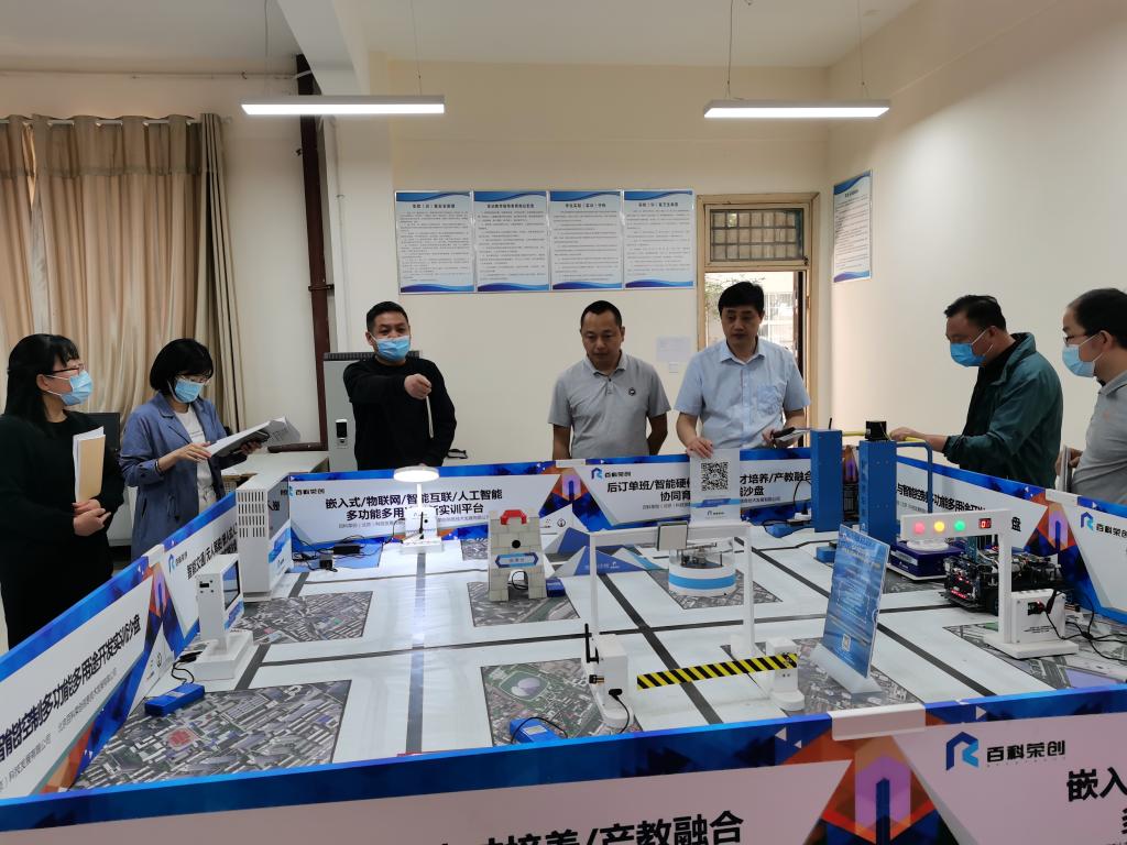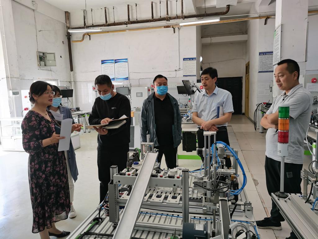 2022年5月3日上午,教务处苏奎处长、李学威处长、张新安科长、苑明莉老师到公司实训室检查指导工作,公司李向前经理、教学办主任丁兰花、实训中心主任徐勇光和各项目负责人陪同检查。
