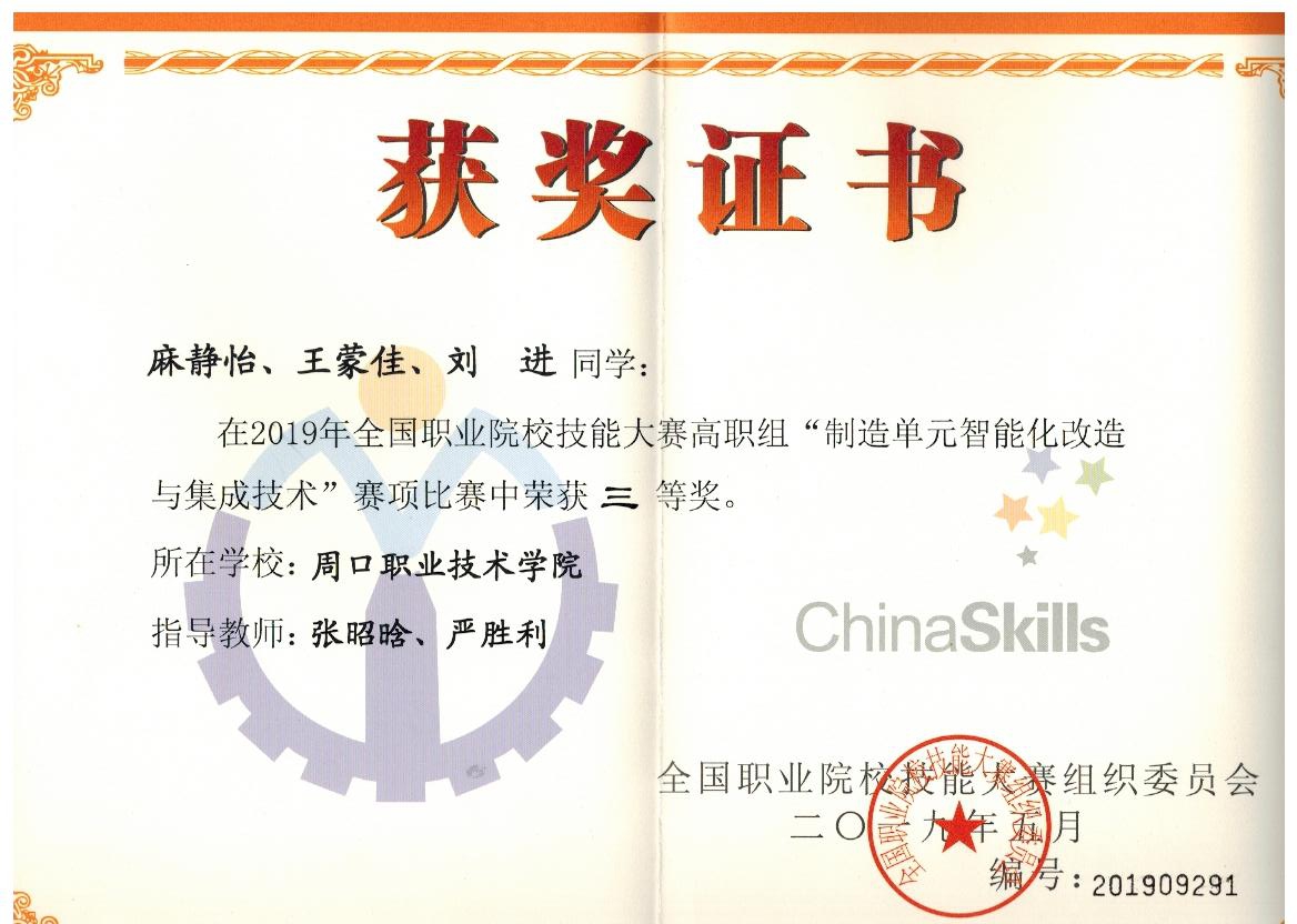 2019年6月2日,第十二届全国职业院校技能大赛成绩揭晓,yl23411参赛队再创佳绩,麻静怡,王蒙佳,刘进三名员工,在严胜利经理和张昭晗老师的精心指导下,代表河南省参加的“制造单元智能化改造与集成技术”项目,获得国赛三等奖。