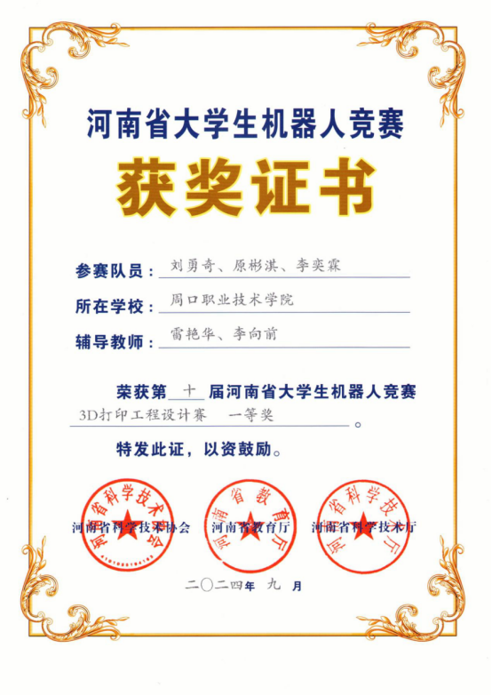 在学院领导的大力支持下,公司多支队伍以其优秀的表现在众多参赛队伍中脱颖而出,斩获一等奖4项,二等奖2项,三等奖1项。其中吕培源、刘庭、王杰(指导教师李向前、陈文静)参加“机器人舞蹈”,获得一等奖;刘勇奇、原彬淇、李奕霖团队(指导教师雷艳华、李向前),参加“3D打印工程设计赛”,获得一等奖;刘世冰、牛闯、窦书为团队(指导教师田伟华、丁兰花),参加“机器人专项赛”,获得一等奖;赵誉翔、孙琳睿、张豪炀团队(指导教师张昭晗、黄梦真),参加“机器人专项赛”,获得一等奖;何永琪、王钧召、胡家硕(指导教师袁永、徐勇光),参加“机器人专项赛”,获得二等奖;王文科、赵哲、宋嘉诚团队(指导教师张月霞、屈莹莹)参加“机器人专项赛”,获得二等奖;郭延强、朱恩光、郭超楠团队(指导教师张月平、崔东风)参加“机器人专项赛”,获得三等奖。