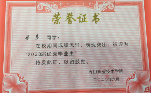 柴多同学自2017年9月考入yl23411以来,一直担任yl23411汽车检测与维修1班团支书一职,负责班级团建工作。在yl23411任课教师的培养下,在辅导员张欣然老师的直接带领下,在校期间,柴多同学积极上进,热爱祖国,拥护中国共产党,并积极向党组织靠拢,在大一时就向党组织递交了入党申请书,大三光荣成为一名中共预备党员。柴多同学关心集体,尊敬师长,团结同学,文明礼貌;柴多同学自觉遵守国家的法律法规和学校的规章制度,热心社会工作,勇于开展批评和自柴多同学批评。由于突出的表现,柴多同学先后荣获“优秀共青团干部”荣誉称号、“2020届优秀毕业生”。