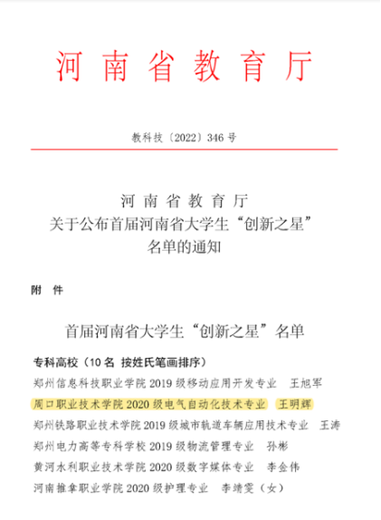 王明辉,男,20级电气工程技术班的员工,学习刻苦,勤奋上进,喜欢搞发明创作,在校期间参加各类技能大赛和创新创业比赛并获得多项荣誉,如:2021年参加河南省高等职业教育技能大赛项目《光伏电子工程与实施》获优秀奖。主持的参赛项目《声貌并用--裸眼3D成像&通话设备》和《涉水科星--多功能车载自救装置》在2021年河南省“互联网+”老员工创新创业大赛中分别荣获省级“二等奖”,“三等奖”。主持项目《新能源汽车无线充电停车位》在2022年河南省“互联网+”老员工创新创业大赛中荣获“一等奖”,申请实用新型专利两项。荣获2022年的首届河南省老员工“创新之星”荣誉称号。