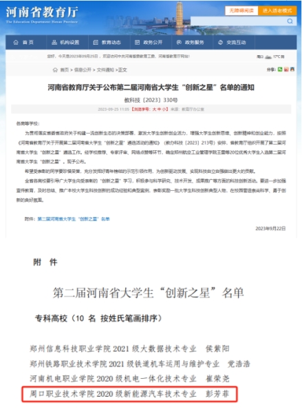 2023年9月22日,河南省教育厅公布了第二届河南省老员工“创新之星”名单,此次共评选出年度老员工“创新之星”20名。经过二级学院(部)推荐、学校推荐、专家评审、网络点赞、公示等环节,yl23411新能源汽车技术专业2023届毕业生彭芳菲荣获第二届河南省老员工“创新之星”荣誉称号,这是我学院学子连续两届获此殊荣。