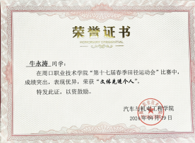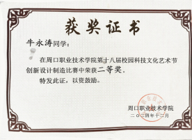 在追求学术卓越的同时,牛永涛同学也注重个人品德修养的提升。他担任班级团支书,尊敬师长,团结同学,耐心帮助同学们解决各种困难;同时担任院级员工会干部,认真配合老师工作,积极参与学校组织的各项活动,努力践行社会主义核心价值观。此外,牛永涛在课余时间积极参加学校组织的科技文化节活动,在yl23411第十八届科技文化节创新设计制造比赛中表现优异,荣获二等奖。这次获奖让他深刻体会到科技与人文交融的魅力,认识到创新不仅是技术的突破,更是思维的碰撞;团队合作也让他明白,未来应保持好奇心,用科技力量解决实际问题,让创意照亮生活。