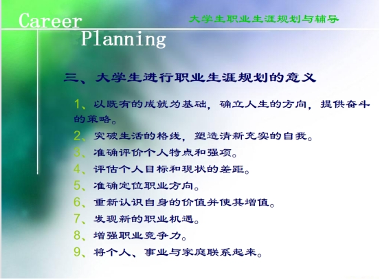 通过此次班会同学们更好地了解自己,并且很好地进行了自我定位;更好地了解专业,了解社会环境;明确了未来切实可行的奋斗目标,此次职业生涯规划,让每位同学参与自己人生目标的设计讨论,实现了“自己订大家议共同监督”,也使同学对相关教育资源的利用更加自觉和更加充分,由“要我学”变成“我要学”。