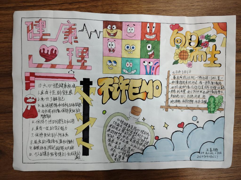 活动期间,同学们热情高涨,全身心投入创作。他们自主查阅各类心理健康资料,相互交流探讨创作思路。以画笔为工具,以画纸为舞台,围绕情绪管理、压力释放、自我认知等心理健康主题精心构思。有的同学为了画好一个表达情绪调节的画面,反复修改草图;有的则和其他同学热烈讨论文字内容的排版。有的用细腻的笔触勾勒出温馨治愈的场景,传递积极乐观的心态;有的配上简洁有力的文字,科普实用的心理调适方法。一份份手抄报不仅是艺术创作,更是同学们内心对心理健康思考的直观呈现。