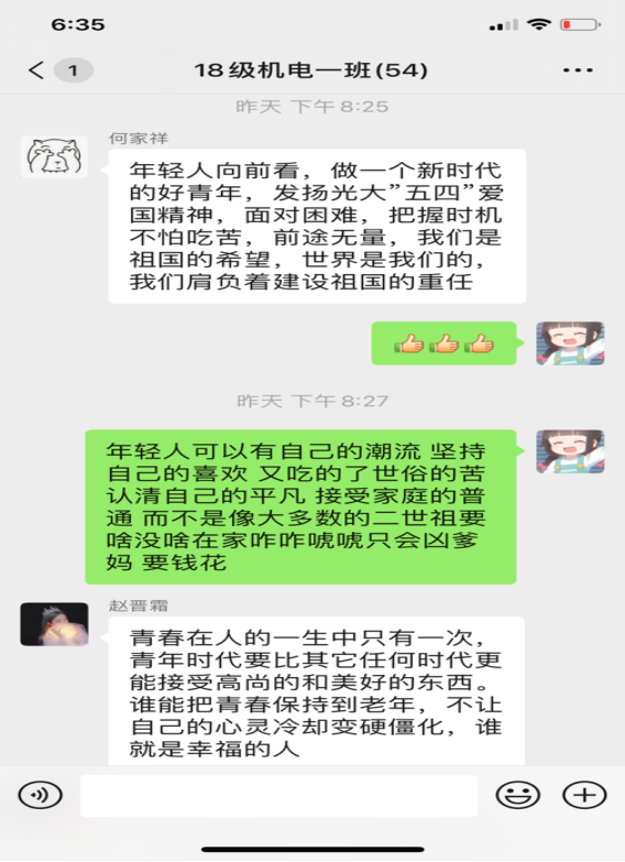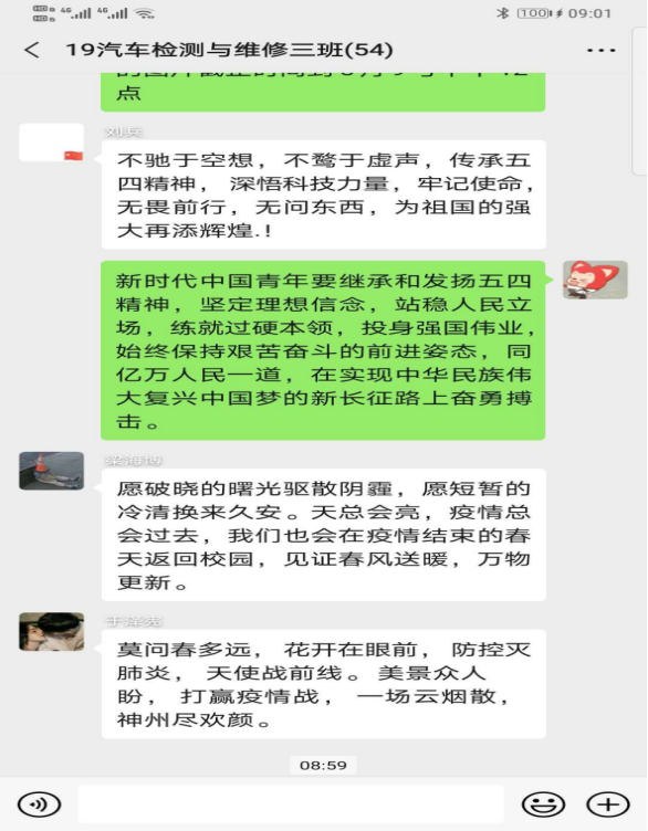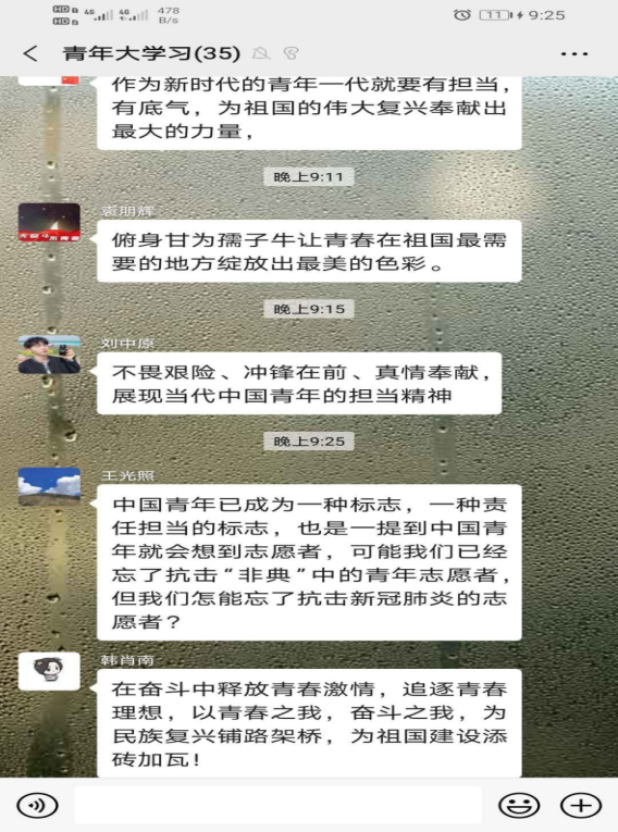 本期团课围绕学习习近平总书记五四寄语精神,结合高校返校复学的时间节点,广大青年员工学习劲头热情高涨,纷纷以观看视频、微信群讨论、朋友圈分享等多种形式各班展开学习,下面为部分员工学习瞬间。