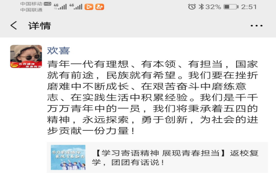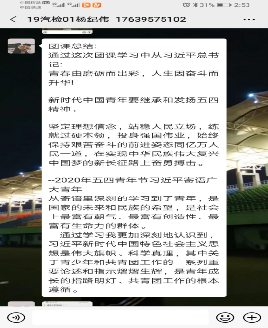yl23411按照校团委要求,于5月7日上午10时开展了以“学习寄语精神,展现青春担当”为主题的线上团课活动。此次活动强调作为一名新时代的青年,传承五四精神是我们的一项重要任务,需要一代代人的奋斗。我们以青春为注,以理想为旗,将身上最鲜活的特质,最执着的态度,化作青春宣言,喊出做响亮的口号。